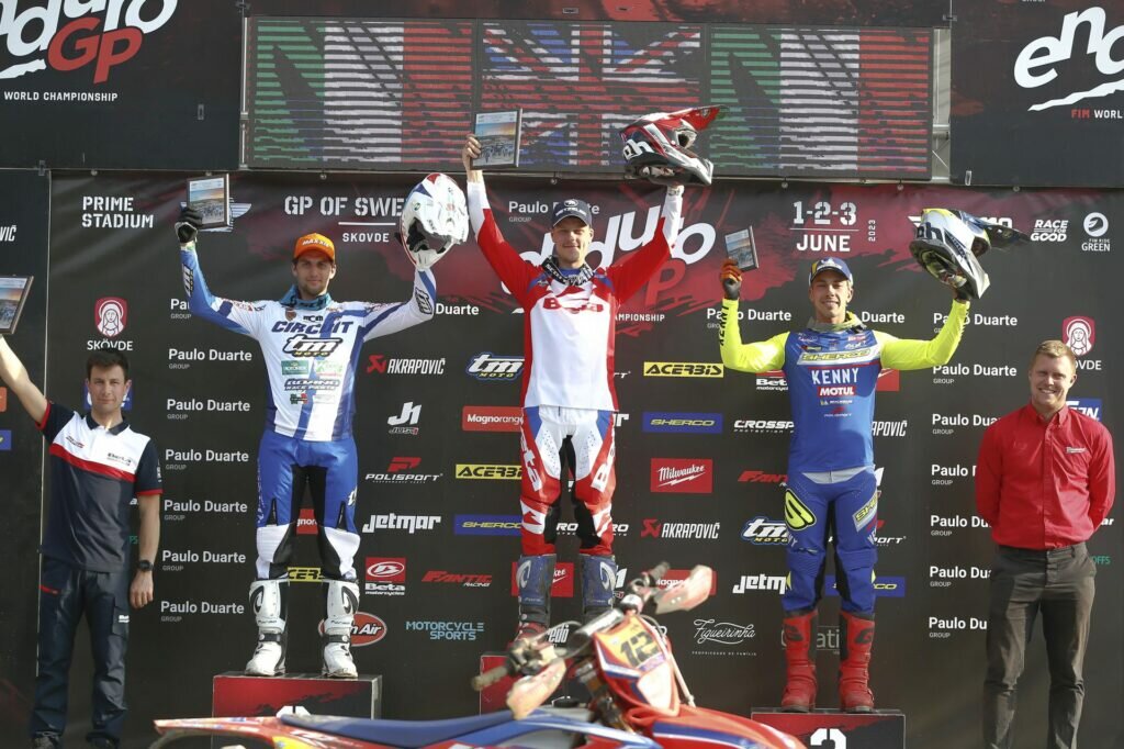 Il migliore dei nostri piloti è stato ancora Matteo Cavallo che è salito ancora una volta sul podio dopo gli ottimi risultati ottenuti anche al GP precedente in Finlandia. A Skovde Matteo Cavallo ha corso una gara incredibile chiudendo al terzo posto nella giornata di sabato nella classe E3 e migliorando nella giornata di domenica il proprio score con un secondo posto nella classe E3 che gli sono valsi la Top Ten della classe EnduroGP con un nono posto finale. Ora Cavallo occupa la seconda posizione nella classe E3.